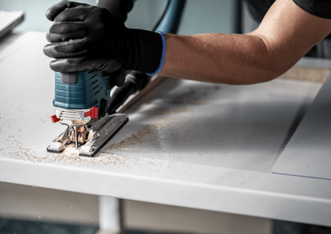 Hohe Präzision für ausrissfreies Schneiden von laminierten Arbeitsplatten! Bi-Metall Blatt: Kombiniert harte Zähne mit flexiblem Blattkörper Unter Tischlern und Schreinern war es schon immer eine Kunst sicherzustellen, dass der sichtbare Teil des Arbeitsmaterials die „saubere Seite“ eines Stichsägenschnitts zeigt. Manchmal muss man das Werkstück zum Sägen umdrehen oder sägt von der Unterseite, um die gewünschte Schnittqualität auf der Sichtseite zu haben. Oder du verwendest das EXPERT ‘Hardwood 2-side clean’, welches dank seiner Zahngeometrie auf beiden Seiten einen perfekten, ausrissfreien Schnitt bietet. Hergestellt aus Bi-Metall – einer Leiste aus Schnellarbeitsstahl, die auf ein flexibles Stahlblatt geschweisst wird, um Festigkeit und Flexibilität zu kombinieren – ist das Bosch EXPERT ''Hardwood 2-side clean'' Stichsägeblatt robust genug um beschichtete Küchenplatten aus Grobspanplatten oder Hartholz zu schneiden. Erhältlich für ausrissfreie gerade Schnitte (T308BF) und für besonders genaue ausrissfreie Winkelschnitte (T308BFP) Ausrissfreie Schnitte mit 2-side Clean Geometry