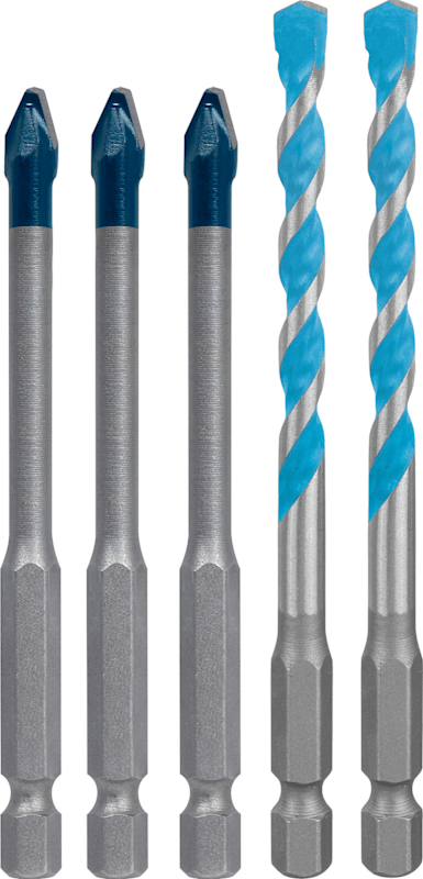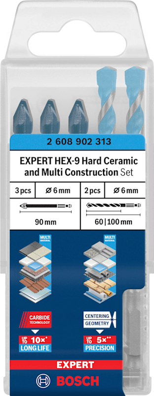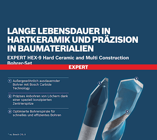 Lange Lebensdauer in Hartkeramik und Präzision in Baumaterialien! Präzises Anbohren von Löchern dank einer speziell konzipierten Zentrierspitze Beim Bohren in Fliesen können Sie das Loch präzise anbohren, ohne dass die teure Fliese Schaden nimmt. Sobald die Fliese durchbohrt ist,benötigst du für die darunterliegenden Werkstoffe einen Multimaterialbohrer. Für diese Aufgaben haben wir den Bohrersatz EXPERT HEX-9 Hard Ceramic und Multi Construction entwickelt, mit dem du beide Aufgaben problemlos bewältigen. Das Set mit EXPERT HEX-9 Hard Ceramic und Multi Construction enthält Bohrer, mit denen sich problemlos zwei grundverschiedene Arbeiten bewältigen lassen. Dank unserer Carbide Technology ist die EXPERT HEX-9 Hard Ceramic außergewöhnlich robust und langlebig: Damit kannst du auch die härtesten Keramikfliesen anbohren. Der EXPERT HEX-9 Multi Construction ermöglicht dank der Bosch Centering Geometry das präzise Anbohren aller gängigen Baumaterialien hinter den Fliesen damit kannst du die Löcher genau dort bohren, wo sie sein sollen. Außergewöhnlich ausdauernder Bohrer mit Bosch Carbide Technology