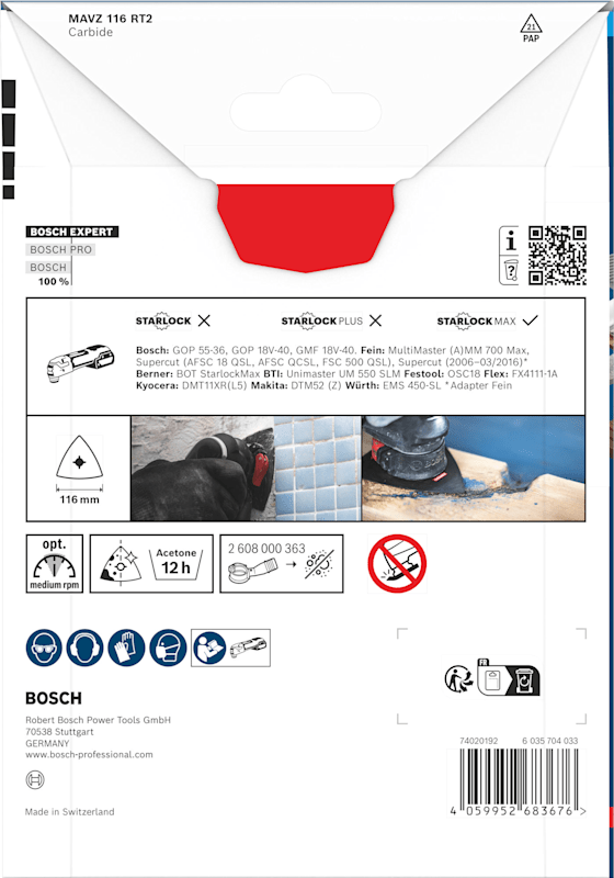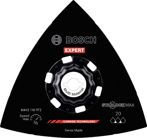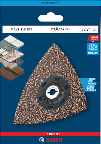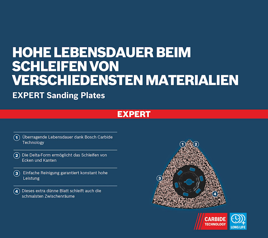 Hohe Lebensdauer beim Schleifen von verschiedensten Materialien! Die Delta-Form ermöglicht das Schleifen von Ecken und Kanten Kleine, aber harte Schleifarbeiten zum Entfernen von altem Material und zum Vorbereiten von Oberflächen sind mit herkömmlichen Schleifmaschinen oder von Hand fast unmöglich zu erledigen. Selbst wenn du die Oberfläche erreichen kannst, reißt das Schleifpapier ein. Mit der EXPERT Sanding Plate kannst du jedoch mit deinem oszillierenden Multifunktionswerkzeug Ecken erreichen und schwierige Materialien schleifen. Die groben, offenen Körner des RT2 (Körnung 20) eignen sich am besten zum Entfernen von Mörtel hinter Fliesen, von Teppichkleber oder für die Grobbearbeitung von Holz. Der RT4 (Körnung 40) eignet sich am besten zum Entfernen von dickem Lack, er kann aber auch mit Mörtel und Kleber umgehen. Der RT6 (Körnung 60) ist der Lackspezialist, während der RT10 (Körnung 100) ideal zum Schleifen und Vorbereiten sauberer Holzoberflächen geeignet ist. Überragende Lebensdauer dank Bosch Carbide Technology
