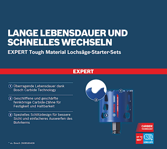 Lange Lebensdauer und schnelles Wechseln! Geschliffene und geschärfte feine Carbide-Zähne für Festigkeit, Langlebigkeit und Präzision Die meisten Lochsägen für Holz und Metall scheinen gut zu funktionieren bis du auf einen gehärteten Nagel oder eine Schraube triffst. Ein kurzer Ruck und jetzt fehlen ein paar Zähne. Mit ihren Carbide-Zähnen wird die EXPERT Multi Material PC Plus kaum langsamer, wenn sie auf Metall trifft. Sie schneidet das Material leicht und zuverlässig. Die Bosch EXPERT Multi Material PC Plus ist ein exzellenter Allrounder für jeden professionellen Nutzer denn nur ein halbes Loch kann niemand gebrauchen. Überragende Lebensdauer dank Bosch Carbide Technology