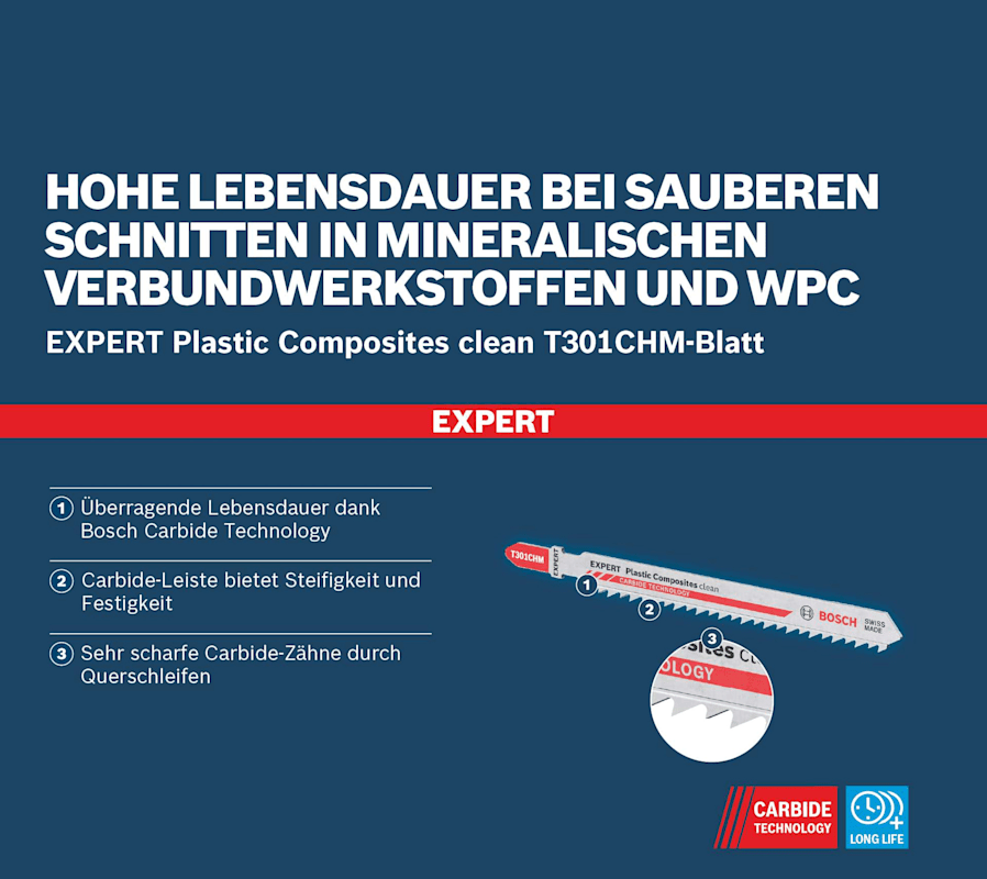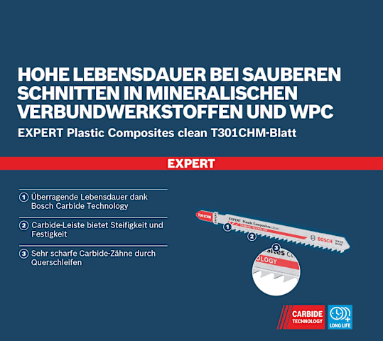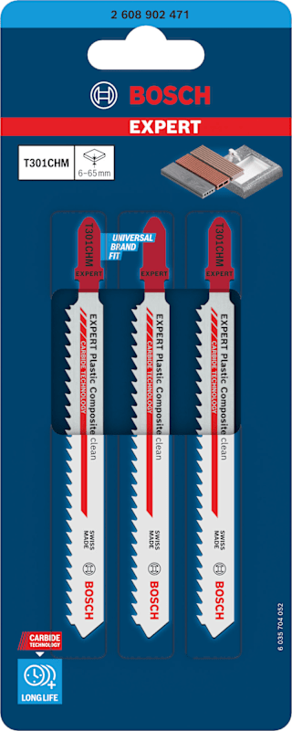 Hohe Lebensdauer bei sauberen Schnitten in mineralischen Verbundwerkstoffen und WPC! Geschränkte Zähne, um dickere Materialien effektiv zu schneiden Feststoffoberflächenmaterialien sind in modernen Bad- und Kücheninstallationen vielseitig einsetzbar und leichter zu schneiden als Stein oder Keramik. Sie müssen sorgfältig bearbeitet werden, damit du keinen Fehler machst, denn dieser wäre teuer. Das EXPERT Plastic Composites clean T301CHM wurde extra für diese Arbeit konzipiert und ist robust genug. Diese Eigenschaften machen das Bosch EXPERT Plastic Composites clean T301CHM-Stichsägeblatt zur perfekten Wahl für die Einrichtung von Küchen und Badezimmern sowie für WPC-Arbeiten. Durch seine lange Lebensdauer wird ein gutes Preis-Leistungs-Verhältnis und gleichzeitig ein Ergebnis von höchster Qualität erzielt. Überragende Lebensdauer dank Bosch Carbide Technology
