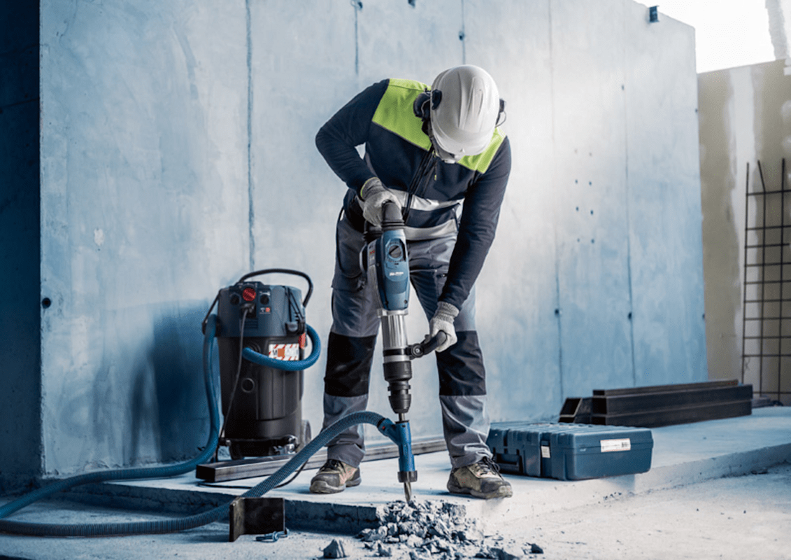 Verbesserte Staubreduzierung beim Aufbrechen von Beton! Das RTec-Element sorgt für einen höheren Materialabtrag Bei Betonabbrucharbeiten entsteht nicht nur viel Betonschutt, auch die Atemluft am Arbeitsplatz wird mit Staub belastet. Wie wäre es, wenn du den Staub einfacher loswerden könntest? Wir haben das EXPERT SDS Clean Set for Chiselling entwickelt, damit die Umgebungsluft während der Arbeit möglichst sauber gehalten wird. Abbrucharbeiter, die SDS max Meißel zum Aufbrechen von Beton einsetzen und eine wirksame Lösung zur Staubabsaugung benötigen, profitieren vom EXPERT SDS Clean Set for Chiselling. Do kannst den Adapter mit dem RTec-Element für den Energiereflexionseffekt problemlos an selbstschärfenden Bosch SDS max Meißeln montieren und an einen Staubsauger anschließen, um die Staubbelastung am Arbeitsplatz zu minimieren. So kannst du die Arbeit effizient erledigen und ohne Unterbrechungen mit der nächsten Aufgabe fortfahren. Hocheffizienter Abtransport von Staub mit Bosch Particle Control