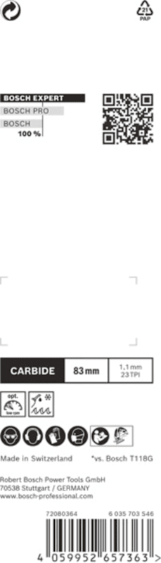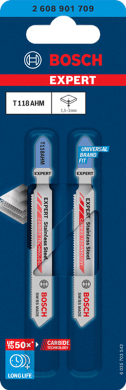 Herausragende Lebensdauer in Edelstahlblechen! Carbide-Leiste bietet Steifigkeit und Festigkeit Das Schneiden von Blechen aus Edelstahl ist eine Aufgabe, die Metallarbeiter täglich durchführen müssen. Auch bei der Montage von Küchen und in Industrie- oder Bürogebäuden ist dies üblich. Profis, die diese Arbeit erledigen, benötigen ein Blatt, das zuverlässig ist und weiter funktioniert, damit sie nicht ständig die Blätter austauschen müssen. Das Bosch EXPERT ‘Stainless Steel’ Stichsägeblatt für dünnes Material gibt es in zwei Versionen: Das T118 AHM für sehr dünne Bleche hat eine sehr feine Zahnteilung. Das T118 EHM mit mittelfeinen Zähnen ist daher der beste Wahl für Profis, die dünne Bleche aus hochfestem Stahl oder Rohre mit mittleren bis dünnen Wänden schneiden müssen. Überragende Lebensdauer dank Bosch Carbide Technology