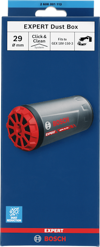 Staubreduzierung beim Schleifen! Staub abschütteln mit einer manuellen Filterreinigungsfunktion Der Staub wird noch vor seiner Freisetzung aufgefangen, sodassdein Arbeitsplatz sauberbleibt. Wir haben die EXPERT Dust Box für Exzenterschleifer entwickelt, umdir den Staub zu ersparen. Die EXPERT Staubbox ist ein robustes Zubehörteil zum Auffangen von Schleifstaub. Dank Schraubdeckel und Abklopfeinrichtung für den HEPA-Filterkannst du die Box ganz einfach ausleeren und noch länger verwenden. Die EXPERT Dust Box ist mit dem Click&Clean-System ausgestattet, sodass du auch eine Staubabsaugung anschließen kannst Passend zu: GEX 18V-150-3 Professional.