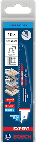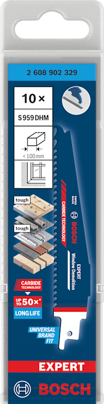 Langlebiges Schneiden von Fenstern aus jedem Material! Kraftvoller, klauenförmiger Zahn und ein großer Spanraum für schnelle Tauchschnitte Das Ausschneiden von Fenstern zum Austausch oder während Abrissarbeiten war immer eine schwierige Aufgabe, wenn mehrere Fenstermaterialien wie stahlverstärktes Holz oder Kunststoff gesägt werden mussten. Da für Fenster-Fixierschrauben immer häufiger hochfester Baustahl verwendet wurde, konnten die alten Bimetall-Blätter keine einzige Schraube mehr durchdringen. Durch die Kombination aus Langlebigkeit, Effizienz und der Fähigkeit, Fenster- oder Türabbrucharbeiten durchzuführen, ist das Bosch EXPERT Window Demolition Säbelsägeblatt sehr beliebt bei Fensterbauern. Es widersteht sogar dem Kontakt mit Mauerwerk, Mörtel und Gips. Überragende Lebensdauer dank Bosch Carbide Technology