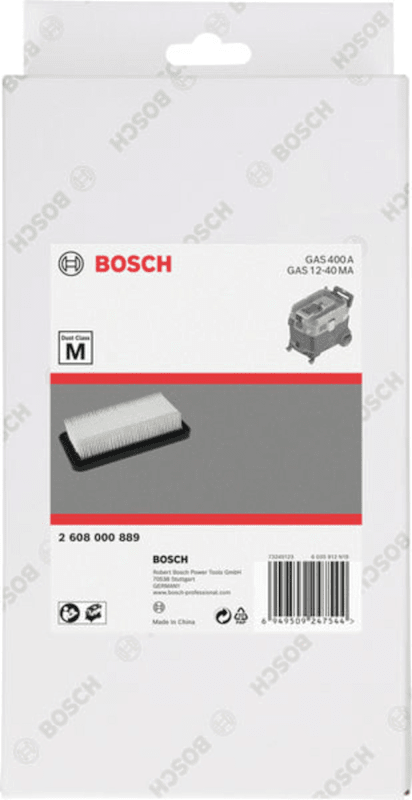 Der flache Plisseefilter ist ein Ersatzfilter für die Allzwecksauger von Bosch. Passend zu: GAS 12-40 MA (0 601 9M0 1.). GAS 400 A (0 601 9M0 0.) Professional.