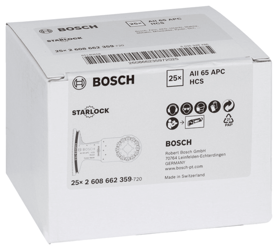 Das Tauchsägeblatt Starlock AII 65 APC ermöglicht breite und präzise Schnitte in Holz. Seine abgerundete Blattspitze (Curved-Tec) ermöglicht präzise und glatte Tauchschnitte. Die flache Blattgestaltung reduziert Lateralschwingung und ermöglicht mittels direkter Kraftübertragung präzise Schnitte. Das zur Basis verjüngte Blatt minimiert Verklemmen, transportiert Späne schneller ab und sorgt somit für einen präzisen Schnitt. Dieses Produkt wird verwendet für das Tauchsägen in Weichholz, das Ablängen von Türstöcken in Bodenhöhe und das Sägen von Aussparungen in Möbelbauteile. Das Starlock-Aufnahmesystem ermöglicht einen schnellen Blattwechsel ohne Blattberührung in drei Sekunden. Das Aufnahmesystem ermöglicht durch seine dreidimensionale enge Passung maximale Kraftübertragung zwischen Maschine und Zubehör.