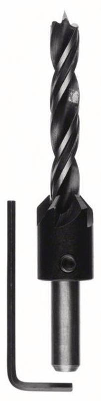 Dieser Multifunktionsbohrer aus Werkzeugstahl besitzt einen Senkwinkel von 90 Grad, fünf Schneidekanten und kann auch als Tiefenanschlag verwendet werden. Der Senker beinhaltet einen Sechskant-Stiftschlüssel, einen Holzspiralbohrer und einen auf dem Aufsteckhalter montierten Kegelsenker.