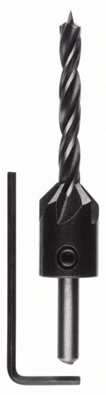 Dieser Multifunktionsbohrer aus Werkzeugstahl besitzt einen Senkwinkel von 90 Grad, fünf Schneidekanten und kann auch als Tiefenanschlag verwendet werden. Der Senker beinhaltet einen Sechskant-Stiftschlüssel, einen Holzspiralbohrer und einen auf dem Aufsteckhalter montierten Kegelsenker.