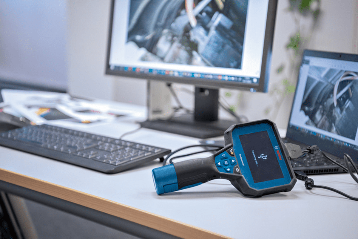 Inspektionskamera GIC 12V-4-23 C, Die Inspektionskamera GIC 12V-4-23 C Professional ist das ideale Werkzeug für Klimatechniker/Installateure, Automechaniker oder Elektriker. Sie verfügt über einen großen 4,3"-Bildschirm, der klare, hochauflösende Bilder mit 800 x 480 Pixeln anzeigt und dadurch eine schnelle und intuitive Analyse von Rohren, Kanälen oder anderen schwer zugänglichen Stellen ermöglicht. Dank der praktischen „Up“-Anzeige mit Pfeil nach oben lässt sich die Bildorientierung leicht erkennen. Diese ergonomische Kamera ist sehr robust für die Verwendung auf rauen Baustellen und an schwer zugänglichen Stellen. Der Kamerakopf erfüllt die Schutzklasse IP67 und ist damit vor Staub und kurzes Untertauchen in Wasser geschützt. das gesamte Gerät ist gemäß IP54 staub- und spritzwassergeschützt. Diese Inspektionskamera ist ideal für zahlreiche handwerkliche Anwendungen wie Inspektionen des Inneren von Verteilerkästen, Rohren und Wandhohlräumen sowie für Hydrauliksysteme und Anwendungen im Automobilbereich. Die mit der GIC 12V-4-23 C Professional erstellten Fotos lassen sich leicht über ein USB-C®-Kabel übertragen. Kamerakabel für GIC, Ø 8,3 mm, Länge 1,5 m (1 600 A02 R6M). Haken, Magnet, Spiegel. USB-C™-Kabel. AA1 Alkaline Akku-Adapter (1 608 M00 C1B). 4 x 1,5 V-LR6-Batterie (AA)