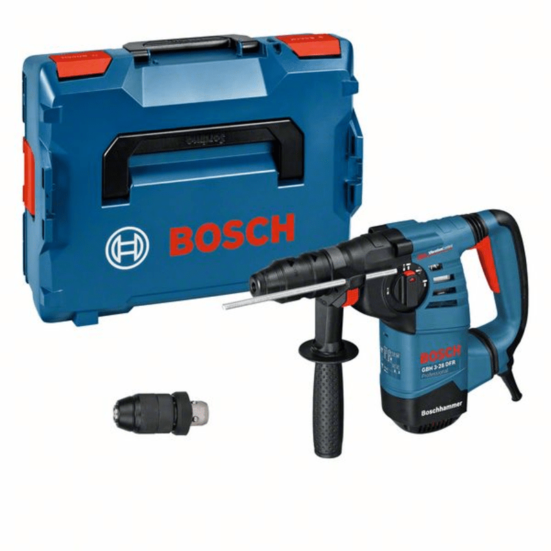 Bohrhammer mit SDS plus GBH 3-28 DFR, Der GBH 3-28 DFR Professional hat die vielseitigste Leistung im SDS plus Segment kabelgebundener Bohrhammer. Das kompakte Gehäuse ermöglicht vielfältige Anwendungen bei begrenzten Platzverhältnissen. Die L-förmige Bauweise sorgt für eine ausgewogene Gewichtsverteilung und Vibration Control für ein müheloses andauerndes Arbeiten. Dank seinem 800-Watt-Motor und einem Werkzeuggewicht von nur 3,6 kg verfügt er über ein hohes Verhältnis zwischen Leistung und Gewicht. Dieses Elektrowerkzeug eignet sich zum Bohren und Meißeln in Beton, Mauerwerk, Holz und Metall. Es ist kompatibel mit verschiedenen Systemzubehören zur Staubabsaugung. Ferner verfügt der GBH 3-28 DFR Professional über ein Schnellspannbohrfutter für Rundschaftbohrer, ein Wechselfutter (SDS plus), Rechts-/Links-Lauf, eine Überlastkupplung, variable Drehzahl und Vario-Lock. Tiefenanschlag 210 mm (1 613 001 010); Maschinentuch; L-BOXX 136 (1 600 A01 2G0); Schnellwechselbohrfutter 13 mm (2 608 572 212); Wechselfutter SDS plus (2 608 572 213); Zusatzhandgriff (2 602 025 191); Fetttube (ET-Nr. 1 615 430 010); 1/2 L-BOXX-Einlage für Gerät (1 600 A00 2WA)