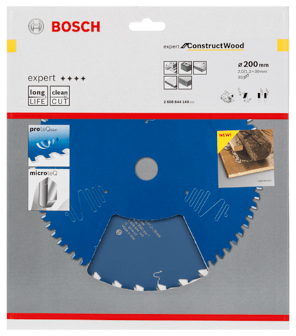 Das Expert for Construct Wood Kreissägeblatt ist höchst resistent beim Schneiden von Bauholz. Die besonders harten Microteq-Zähne werden bei Bosch intern aus höchst robustem Carbide-Korn produziert, um eine hohe Leistung und Lebensdauer sicherzustellen. Beides wird durch die Kombination spezieller Oberflächen und der breiten Zahnrücken unterstützt. Die Körper- und Dehnungsschlitze des Blatts verringern Schwingungen während des Gebrauchs, wirken geräuschdämpfend und reduzieren die Hitzeentwicklung. Das Expert for Construct Wood Kreissägeblatt verfügt außerdem über eine Schutzbeschichtung, die Korrosion verhindert und zuverlässiges Schneiden ermöglicht, während Reibung reduziert wird. Verwenden Sie dieses Sägeblatt bei Bauholz mit Fremdkörpern, wie z. B. Nägeln und Betonrückständen. Das Expert for Construct Wood Kreissägeblatt verfügt über eine ATB- (Wechselzahn) und Pyramidenzahngeometrie für müheloses Schneiden von Bauholz mit und ohne Nägeln.