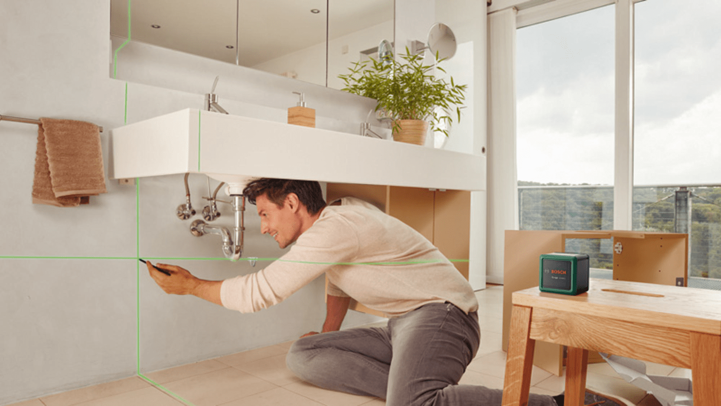 Kreuzlinien-Laser Quigo Green Set. Grünes Licht für deine Ideen!. Grüne Lasertechnologie für bis zu viermal bessere Sichtbarkeit als mit roten Laserlinien, selbst bei hellen Lichtverhältnissen. Verbes
