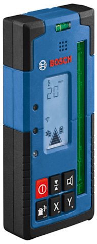 Laser-Empfänger LR 65 G, Der kompakte und robuste LR 65 G Professional ist ein hochwertiger Laser-Empfänger, der mühelos grüne Laser erkennt. Sein langes Empfangsfenster (125 mm) und beidseitiges Display mit Hintergrundbeleuchtung und Millimeter-Offsetfunktion gewährleisten effizientes Arbeiten und schnelle Lasererkennung. Das langlebige Gummitastenfeld, der Schutz gegen Staub und Wasser gemäß IP67-Norm, und das Gehäuse mit robuster Softgriffummantelung machen ihn zum perfekten Gerät für Einsätze in rauer Umgebung. Bluetooth®-Kommunikation mit dem Rotationslaser GRL 650 CHVG Professional ermöglicht zusätzliche Funktionen wie die Benutzerkalibrierung (uCAL), Dual CenterFind und CenterLock. Der LR 65 G Professional ist ideal für verschiedenste Nivellier- und Ausrichtungsanwendungen im Innen- und Außenbereich. Der Laser-Empfänger bietet fünf Empfindlichkeits- und vier Lautstärkestufen sowie LEDs mit verstellbarer Helligkeit für eine gute Erkennbarkeit des Laserstrahls. Empfängerhalterung RB 60 Professional. 2 x 1,5 V LR6-Batterie (AA)