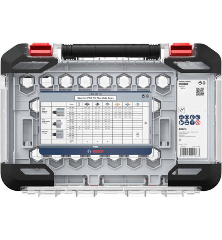 Praktische Aufbewahrung für Lochsägen! Benötigst du einen Koffer, um deine Lochsägen sicher und gut organisiert aufzubewahren? Wir haben den Aufbewahrungskoffer für PRO PC Plus Lochsägen für Profis entwickelt, die eine praktische Aufbewahrungsmöglichkeit für ihre Lochsägen-Sets suchen. Der Aufbewahrungskoffer für PRO PC Plus Lochsägen besteht aus stabilem Kunststoff. Darin lässt sich eine Reihe von Lochsägen mit einer Schnitttiefe von weniger als 45 mm oder bis zu 60 mm sicher aufbewahren.