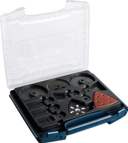 Innenausbau-Set• Passend zu Bosch GOP 10,8 V-LI, Bosch PMF 180 E • Starlock-Aufnahme Lieferung: Im Kunststoffkoffer. Inhalt: 1 BiM-Segmentsägeblatt ACZ 100 BB 1 BiM-TiN-Segmentsägeblatt ACZ 85