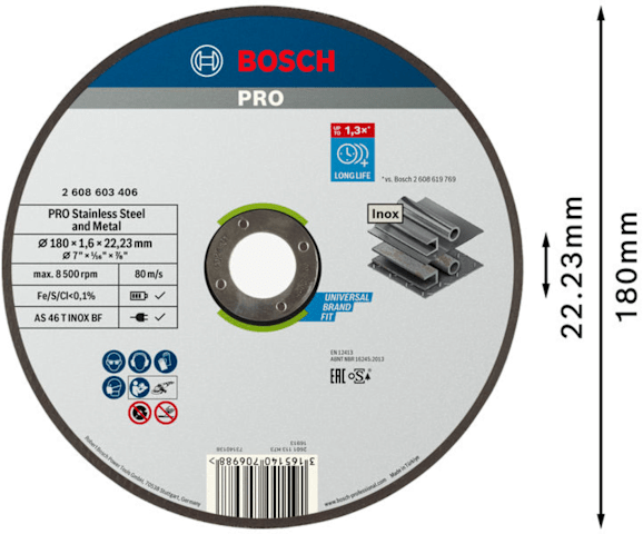 BOSCH PRO STAINLESS STEEL AND METAL TRENNSCHEIBE 180X1,6X22,23MM (2608603406