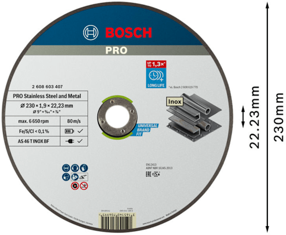 BOSCH PRO STAINLESS STEEL AND METAL TRENNSCHEIBE 230X1,9X22,23MM (2608603407