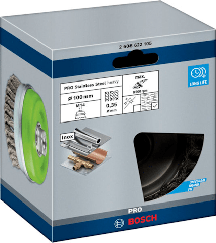 Lange Lebensdauer beim Reinigen von Edelstahl! Gezopfter Premium-Draht für intensive Reinigung Bist du Metallarbeiter und musst Edelstahl und Nichteisenmetalle reinigen? Die PRO Stainless Steel heavy Topfbürste ist ein robustes Zubehör, das für diese Aufgabe geeignet ist. Sie arbeitet schnell und sorgt für saubere, raue Oberflächen – immer und immer wieder. Die PRO Stainless Steel heavy Topfbürste ist eine langlebige Ergänzung für jede Metallwerkstatt, in der Schweißnähte, starker Rost, alte Farbe, Lack und Unterbodenschutz von Edelstahl- und Nichteisenmetalloberflächen entfernt werden müssen. Wir haben die Topfbürste mit hochwertigem gezopftem Draht ausgestattet, damit du anspruchsvolle Reinigungsarbeiten erledigen kannst – immer und immer wieder. Verwende Topfbürsten mit dickerem Draht für ein schnelles, grobes Finish und solche mit dünnerem Draht für eine glattere Oberfläche.