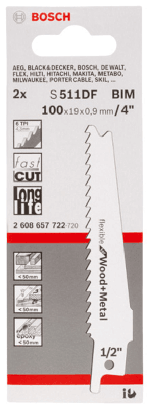 Das S 511 DF Flexible for Wood and Metal Säbelsägeblatt eignet sich für schnelle Schnitte in Holz und Metall. Große Zahnteilung (4 mm) und geschränkte Zähne ermöglichen schnelles Schneiden. Das Bi-Metallblatt ist zudem für das Schneiden von weichen Nägeln, Baustahl und NE-Metallkomponenten in Holz optimiert. Die kurze Länge (100 mm) ermöglicht eine Schnittleistung von bis zu 50 mm, wodurch es ideal geeignet ist für Akkusägen.