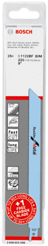 25-tlg. S 1122 BF mit 1-tlg. EXPERT ''Medium-Thick Tough Metal'' S 1155 HHM. Bestens geeignet zum Schneiden von robusten Metallrohren und Profilen mittlerer Dicke. Vielnutzer, die Großpackungen unserer Standard-Metallblätter kaufen, profitieren in der Regel von der EXPERT-Auswahl. Bestens geeignet für Recycling- und Abrissarbeiter - langlebig und leistungsstark. Kostenloses EXPERT-Blatt mit bis zu 50-facher Lebensdauer. 50 x längere Lebensdauer mit der Bosch Carbide Technology.