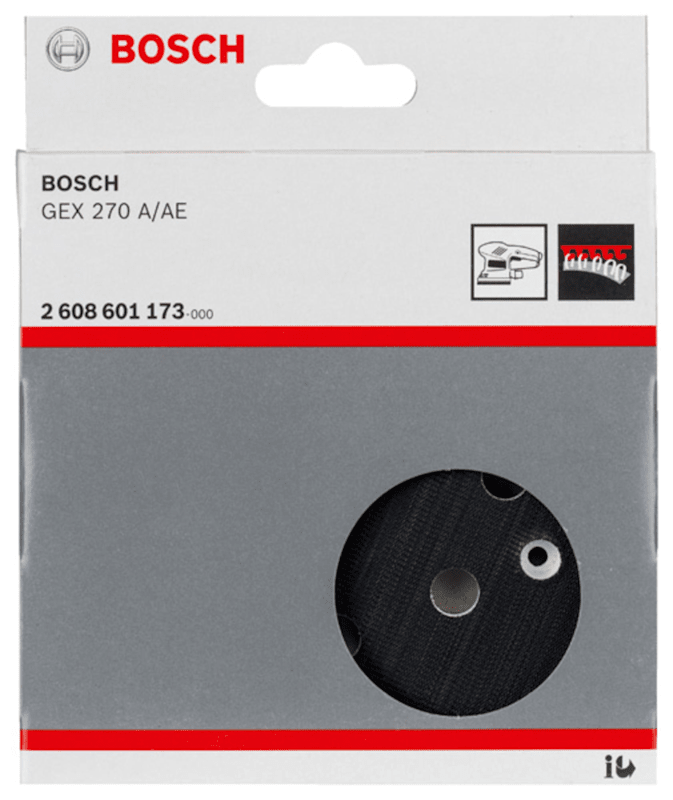 Der Ersatzschleifteller wird mit Schrauben und Sechskantschlüssel geliefert. Auch ein Innensechskantschlüssel ist beigelegt. Es ist geeignet für Exzenterschleifer von Bosch. Passend zu: GEX 270 A. GEX