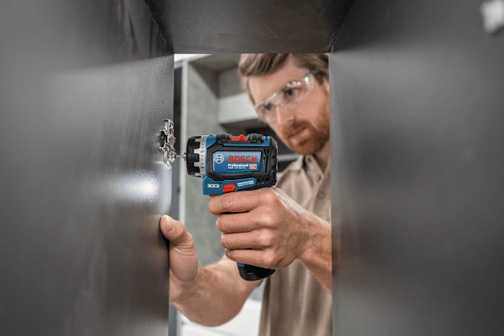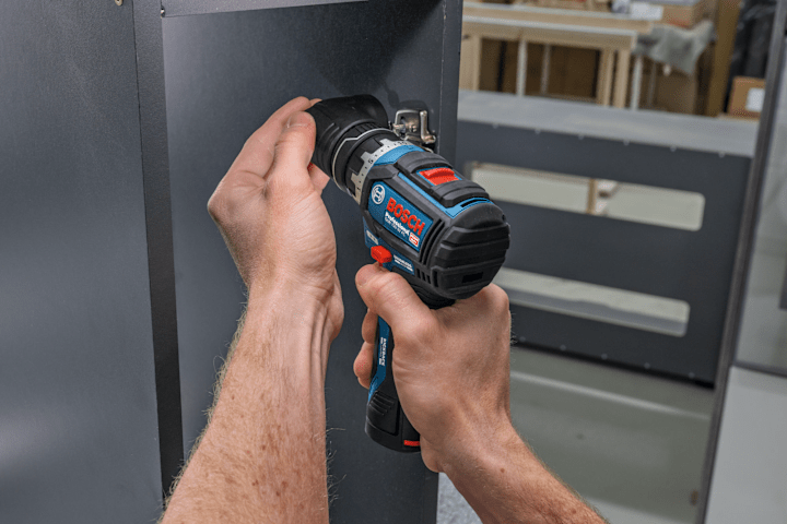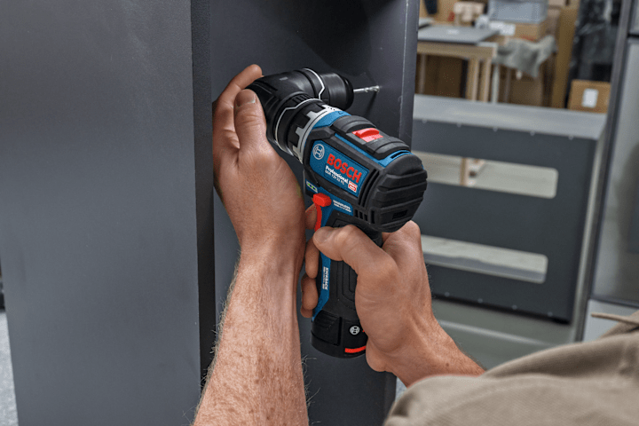 Schrauber GSR 12V-32 FC, Der kabellose PRO GSR12V-32 FC bietet mit Advanced KickBack Control beste Werkzeugkontrolle. Diese Technologie minimiert die Verletzungsgefahr, wenn ein Bohrer abrupt klemmt oder selbst wenn sich das Werkzeug langsam um seine Bohrachse dreht und die Haltekraft langsam zunimmt. Dieser Bohrschrauber ist dank des Bosch Professional FlexiClick Systems mit leicht austauschbaren Aufsätzen zum Bohren und Schrauben vielseitig einsetzbar. Das Werkzeug eignet sich aufgrund seiner sehr kompakten Bauweise ideal zum Bohren und Eindrehen von Schrauben auf engstem Raum. Mit dem einzigartigen Bohrhammeraufsatz PRO GFA12-H kann das Gerät in einen Bohrhammer mit SDS plus verwandelt werden, der für das Hammerbohren bis Ø10 mm in Beton geeignet ist. Präzises Arbeiten in der Nähe von Kanten und Wänden gelingt mit dem Exzenteraufsatz PRO GFA12-E ganz einfach, während der Winkelaufsatz PRO GFA 12-W den Bohrschrauber zum Winkelbohrer macht. Diese Aufsätze können in einem 360°-Winkel in 16 verschiedenen Positionen arretiert werden, ohne dass sie vom Werkzeug enternt werden müssen. FlexiClick-Aufsätze können spezielle Werkzeuge für gelegentliche Anwendungen ersetzen, wodurch weniger Gewicht auf der Baustelle getragen werden muss. Das Bosch Professional FlexiClick System: Perfekt gerüstet für professionelle Arbeit. Der PRO GSR12V-32 FC ist perfekt für alle Schraub- und Bohrarbeiten in Holz, Metall und, in Kombination mit dem PRO GFA 12-H, sogar in Beton, Mauerwerk und Stein. Weitere Informationen: Der PRO GSR12V-32 FC ist mit Advanced KickBack Control, einem bürstenlosen Motor, einem hellen Arbeitslicht und einem Gürtelclip ausgestattet. L-BOXX 102 (1 600 A01 2FZ). Ladegerät GAL 12V-20 Professional. 2 x Akku GBA 12V 2.0Ah (1 600 Z00 02X). Metallbohrfutteraufsatz GFA 12-M (1 600 A03 7MD). Bohrhammeraufsatz GFA 12-H (1 600 A02 4LN). Zusatzhandgriff. Tiefenanschlag (1 613 001 009)