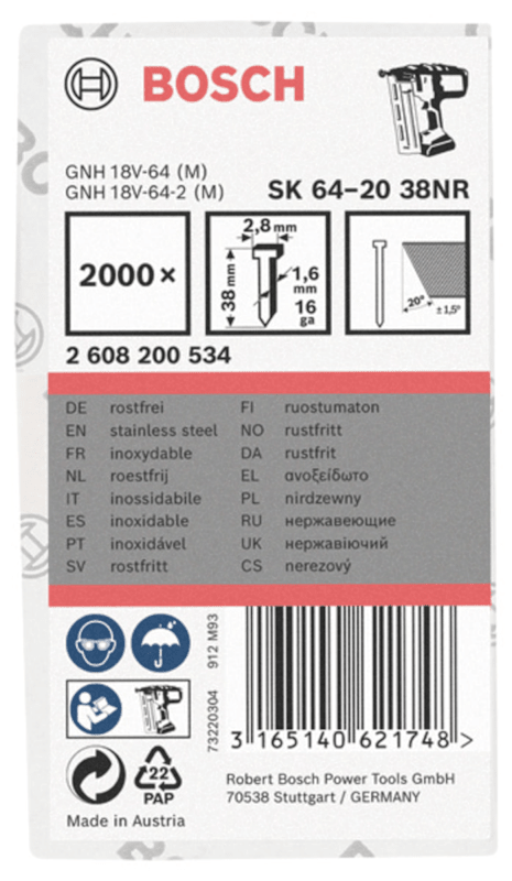 Stauchkopfnagel 1,6/16 g 20° werden aus wetterresistentem Edelstahl hergestellt. Sie sind für Anwendungen wie Kistenbau, Arbeiten mit Polsterung, Tür- und Fensterrahmen, Bilderrahmen, Möbelbau, Wandverkleidungen und für Gipsfaserplatten geeignet. Die Stifte bieten festen Halt bei kaum sichtbarem Stiftkopf. Sie ermöglichen einfaches und schnelles Anbringen von Verkleidungen sowie Zier- und Sockelleisten. Die Senkkopf-Stifte 1,6/16 g 20° werden in Europa hergestellt und haben daher eine hohe, konstante Qualität. Passend zu: GNH 18V-64. GNH 18V-64 M. GNH 18V-64-2. GNH 18V-64-2 M. GSK 18.0 V-LI Professional.