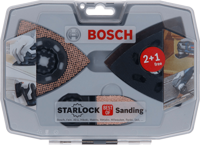 Das Starlock Best of Sanding Set, 6-teilig, ermöglicht das Schleifen von Holz und das Entfernen von Mörtel. Das Set enthält Blätter mit besonders hoher Lebensdauer für schnelles Grobschleifen. Es ist ideal zum Abschleifen dicker Farbschichten und von verwittertem Holz sowie das Ausfräsen und Schleifen von Holz, Gips, Kunststoff-Verbundstoffen und Epoxidharz geeignet. Das Starlock-Aufnahmesystem ermöglicht einen schnellen Blattwechsel ohne Blattberührung in drei Sekunden. Das Aufnahmesystem ermöglicht durch seine dreidimensionale enge Passung maximale Kraftübertragung zwischen Maschine und Zubehör.