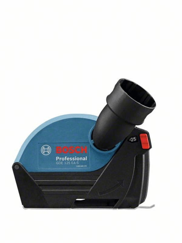 Systemzubehör GDE 125 EA-S, Die aufsteckbare Absaughaube GDE 125 EA-S Professional lässt sich leicht einstellen und ist mit den Bosch Professional Winkelschleifern mit 125 mm Scheibendurchmesser und Schraubkappe kompatibel. Sie kann in zwei einfachen Schritten montiert werden, ohne dass die Scheibe oder die Standardschutzvorrichtung entfernt werden muss – maximaler Komfort. Die Form der Absaughaube wurde für einen sauberen und reibungslosen Betrieb optimiert. Für Arbeiten, für die Präzision erforderlich ist, kann die einstellbare Schnitttiefe verwendet werden. Die Absaughaube ist kompatibel mit dem Bosch Click & Clean System.