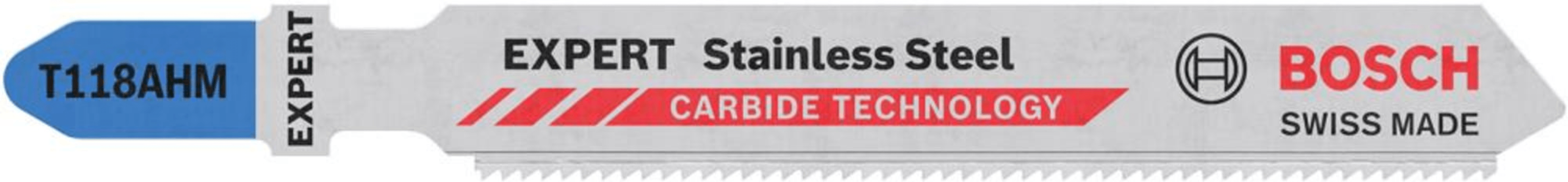 Stichsägeblatt T 118 AHM EXPERT für rostfreien Stahl• Carbide • HM-bestückt • Zähne geschliffen • Gerader, feiner Schnitt • Für rostfreie Edelstahlbleche mit einer Materialstärke von 1,5 bis 3 mm
