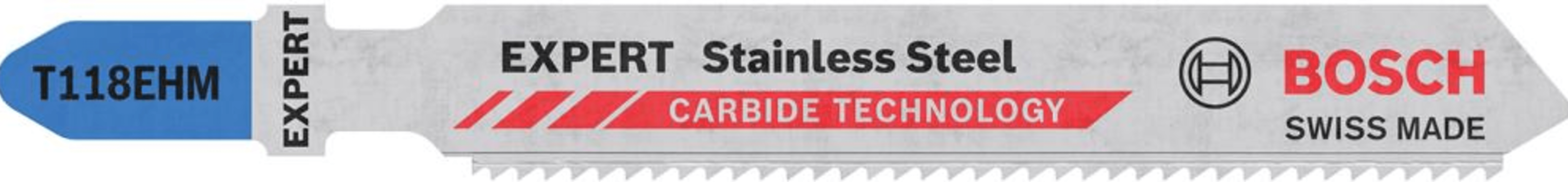 Stichsägeblatt T 118 EHM EXPERT für rostfreien Stahl• Carbide • HM-bestückt • Zähne geschliffen • Gerader, feiner Schnitt • Für rostfreie Edelstahlbleche mit einer Materialstärke von 2 bis 5 mm •