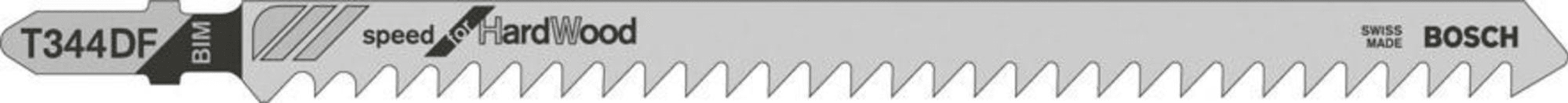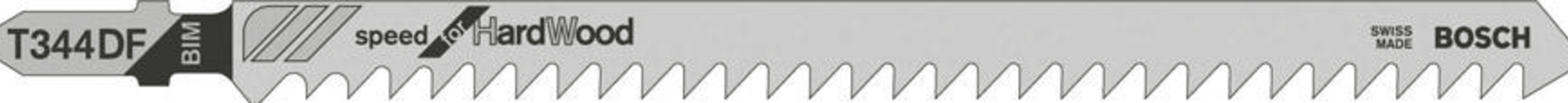 Stichsägeblatt T 344 DF für hartes Holz• Bimetall • Zähne geschliffen und geschränkt • Gerader, grober Schnitt • Für Hartholz und beschichtete Platten mit einer Materialstärke von 5 bis 100 mm • F