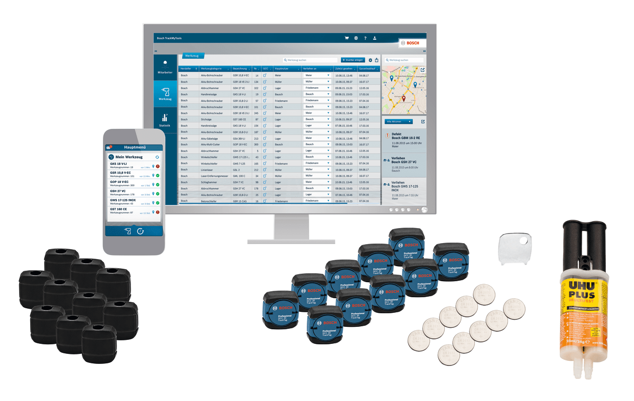 Lieferumfang: Spezialschlüssel, Zwei-Komponenten-Klebstoff, 10 x Lithium-Knopfzellen, 10 x GCA 30-9 Professional, 10 x GCC 30 TrackTag Professional, 3 Monate kostenlose TrackMyTools Software-Nutzung