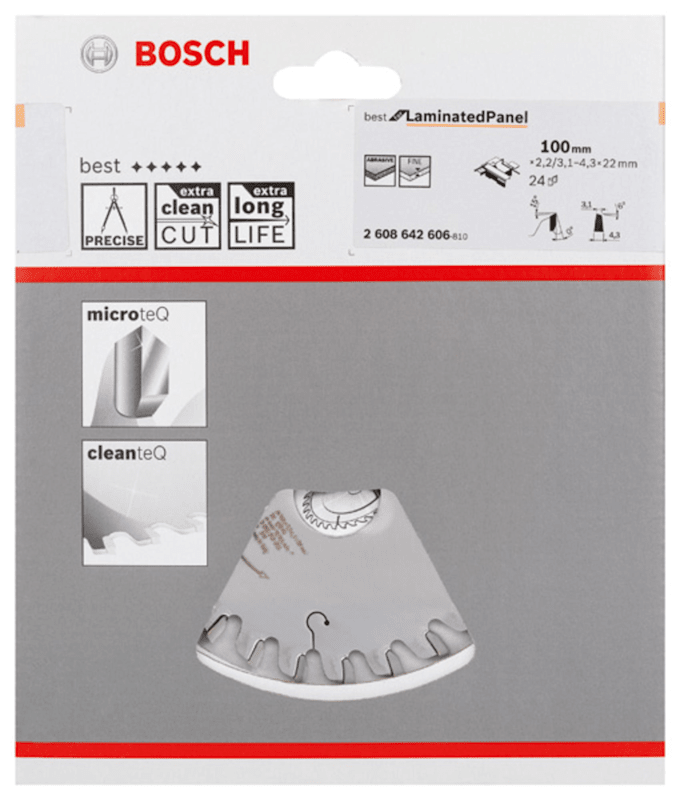 Das Best for Laminated Panel Konisches Vorritzsägeblatt ermöglicht industriequalitative Präzision für sehr anspruchsvolle Anwendungen bei laminierten Paneelen, die an einer oder zwei Seiten beschichtet sind. Diese hohe Leistung und Qualität werden durch die einzigartigen besonders harten Microteq-Zähne verstärkt, die intern bei Bosch hergestellt werden, und aus robustem Carbide-Korn bestehen. Cleanteq reduziert zudem die Anhaftung von Rückständen, wie z. B. Harz und Klebstoff, um besonders saubere Ergebnisse sicherzustellen, während Korrosion verhindert und das Blatt kühl gehalten wird. Dieses konische Vorritzsägeblatt ist für das Schneiden von Spanplatten, Paneelmaterialien und furniertem Laminat konzipiert. Das Produkt mit ATB-Con (Wechselzahn auf konischem Vorritzsägeblatt) macht saubere Schnitte in Holzmaterialien und laminierten Paneelen aller Art.