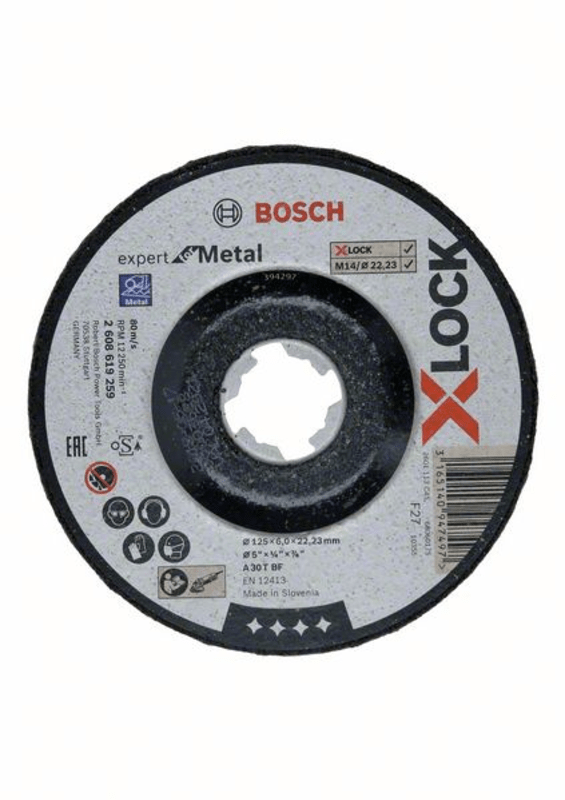 Die X-LOCK Schruppscheibe Expert for Metal bietet bei maximaler Sicherheit eine beindruckend hohe Lebensdauer. Das Schleifkorn der Scheibe aus Aluminiumoxid und die ausgewählten funktionalen Füll- und Zusatzstoffe in der fortschrittlichen Phenolharzmatrix sind speziell für Metall geeignet. Das präzisionsgefertigte Glasfasergewebe der Scheibe sorgt darüber hinaus für hohe Scheibenstabilität und maximale Arbeitssicherheit. Der Wechsel von Scheiben erfolgt dank schlüssellosem X-LOCK System schnell und bequem.