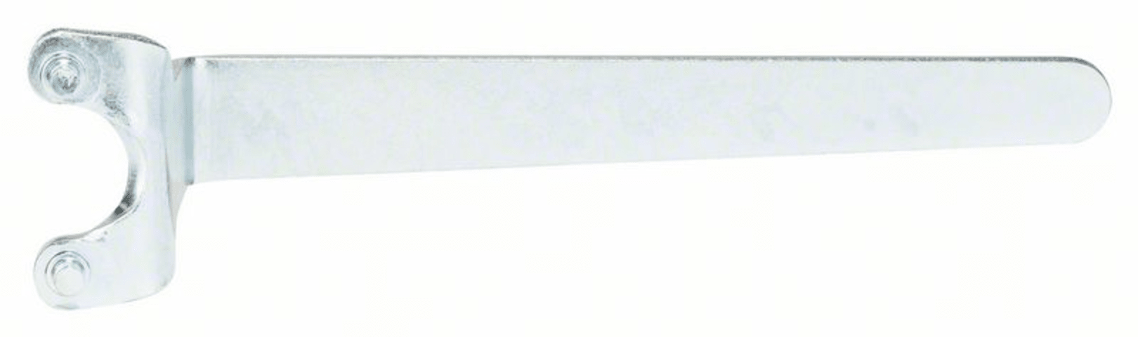 Der Zweilochschlüssel spannt und lockert Aufspannflanschen auf Schleiftöpfen. Er ist im rechten Winkel gebogen.