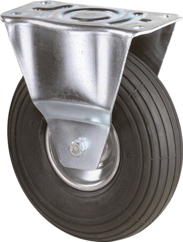 Bockrolle• Gabel aus Stahlblech, verzinkt-chromatiert • Zweireihiger Kugelkranz im Gabelkopf • Rad: Luftbereifung schwarz, Rillenprofil • Radkörper: Stahlfelge • Rollenlager