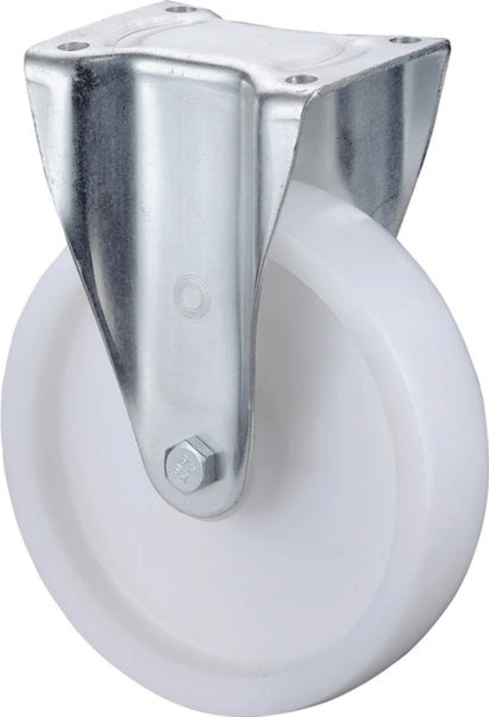 Schwerlast-Bockrolle N110.B10• Zweireihiger Kugelkranz im Gabelkopf • Rollenlager • Material Gabel: Stahlblech, verzinkt-chromatiert • Material Radkörper: Kunststoff • Material Rad: Kunststoff