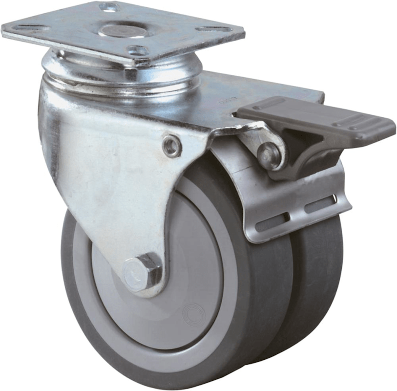 Lenkrolle mit Totalfeststeller• Zweireihiger Kugelkranz im Gabelkopf • Kugellager • Material Gabel: Stahlblech, verzinkt-chromatiert • Material Lauffläche: thermoplastischer Gummi • Material Rad