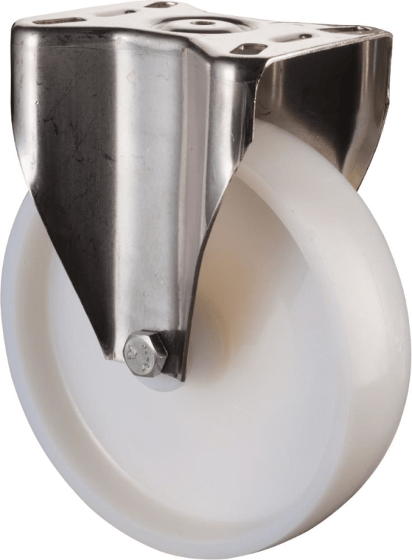 Bockrolle• Gabel aus Edelstahl • Zweireihiger Kugelkranz im Gabelkopf. • Lauffläche: Kunststoff weiß • Radkörper: Kunststoff • Gleitlager