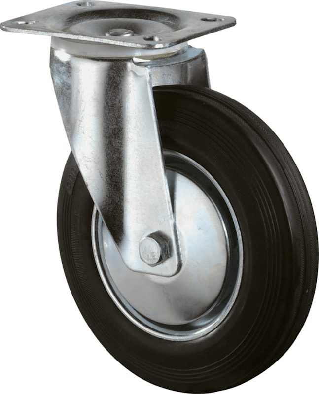 Lenkrolle• Zweireihiger Kugelkranz im Gabelkopf • Rollenlager • Radkörper mit Stahlfelge und Fadenschutz • Material Gabel: Stahlblech, verzinkt-chromatiert • Material Lauffläche: Gummi • Materia