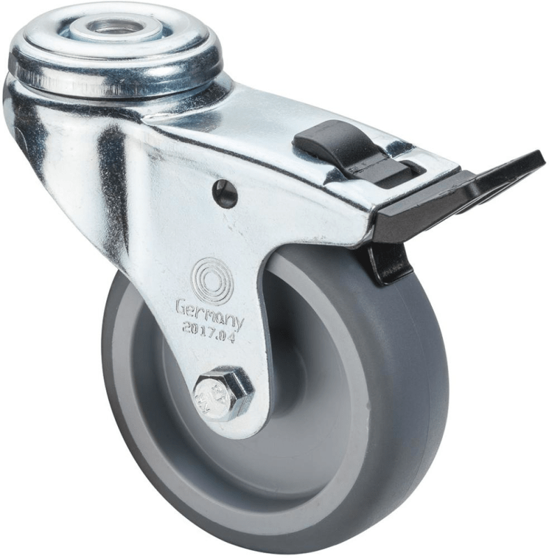 Lenkrolle mit Feststeller• Gabel aus Stahlblech, verzinkt-chromatiert • Zweireihiger Kugelkranz im Gabelkopf • Lauffläche: thermoplastisches Gummi, grau • Radkörper: Kunststoff • Gleitlager