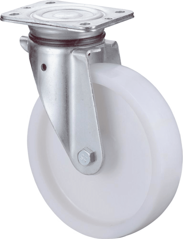 Schwerlast-Lenkrolle N100.B10• Zweireihiger Kugelkranz im Gabelkopf • Geschlossener Gabelkopf • Rollenlager • Material Gabel: Stahlblech, verzinkt-chromatiert • Material Radkörper: Kunststoff •