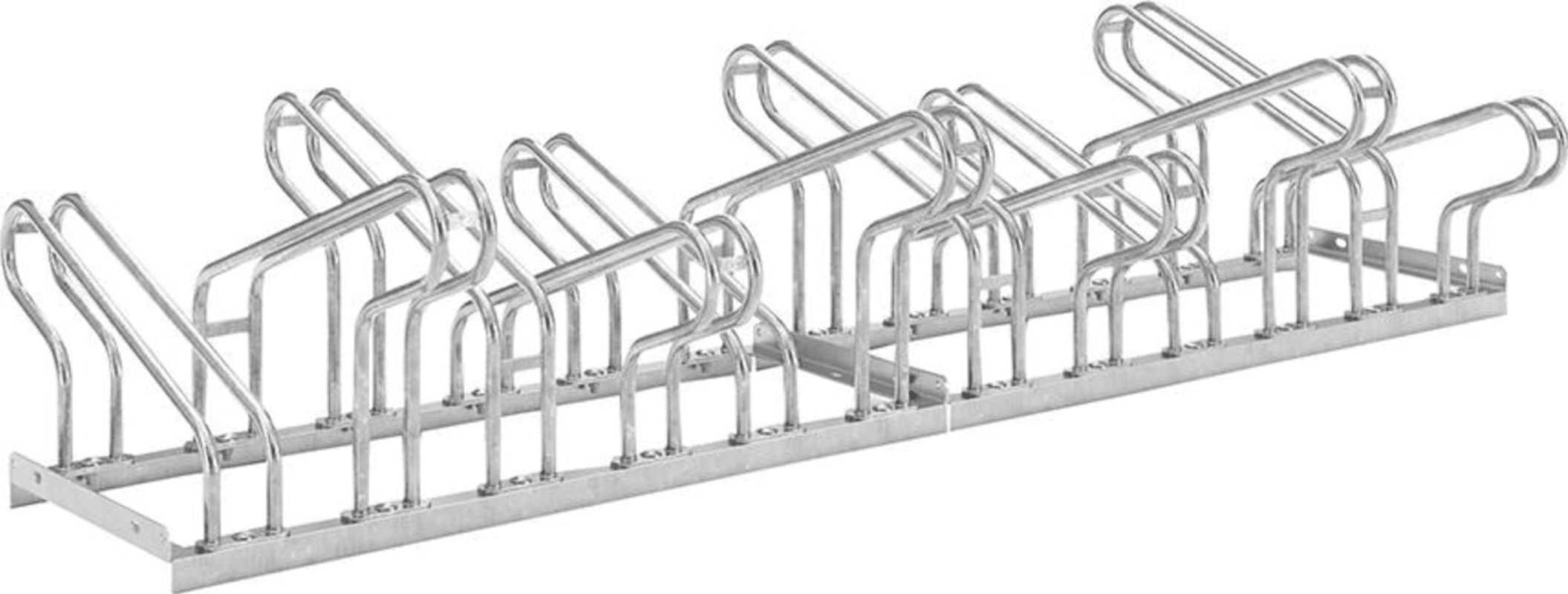 Bügelparker, zweiseitige Radeinstellung, zerlegt • Fahrräder können abwechselnd in Tief-/Hocheinstellung platzsparend geparkt werden • Material: verzinkte Stahlkonstruktion aus Rundrohrbügeln • Inklusive Montagematerial und -anleitung, Austausch einzelner Bügel bei Bedarf möglich, z. B. bei Beschädigung • Radabstand: 350 mm • Radeinstellung: zweiseitig • Bügelabstand für Reifenbreite bis 55 mm • Stellraumtiefe Radstellung 90°, zweiseitig: ca. 3200 mm Hinweis: Vorbereitet zur Reihenverbindung und Bodenbefestigung