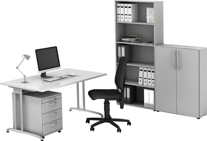 Büro-Komplett-Set, 5-teilig Schreibtisch: • Gestell/Tischfuß: Rundrohr aus Stahl, silber pulverbeschichtet • Tischplatte: melaminharzbeschichtete, 25 mm dick, inklusive Kabelkanal • Maße B x T x H: 1600 x 800 x 720 mm Schrankwand: • Variable Schrankkombination, melaminharzbeschichtet, mit vorderseitig stoßfesten ABS-Sicherheitskanten (2 mm) • Tür: zweiteilig mit stabilen Metallscharnieren und großen Öffnungswinkeln • Schrankböden: höhenverstellbar im 32-mm-Raster • 1 Schrank-Regalkombination mit 1 Regal mit 5 offenen Fächern (B x T x H 800 x 330 x 1880 mm) und 1 Regal mit 3 offenen Fächern (B x T x H 800 x 330 x 1144 mm), dazu ein Paar Türen, 3 OH, die sowohl vor das 5-OH- als auch das 3-OH-Regal montiert werden können Rollcontainer: • Melaminharzbeschichtet, fest verleimter Holzbauweise • Mit praktischer Ablage für Büromaterial und 3 Schubladen auf leichtgängigen Teleskopführungen • Maße B x T x H: 428 x 580 x 590 mm Drehstuhl: • Mit ergonomischer Rückenlehne und Lendenwirbelstütze für einen beschwerdefreien Sitzkomfort • Komfortabler Muldensitz mit blau bezogenem Formpolster • Sitzneigung und -höhe (420–550 mm) stufenlos verstellbar • Sitzbreite und -tiefe jeweils 460 mm, Lehnenhöhe 520 mm Hinweis: Auf Anfrage sind passende Armlehnen und Hartbodenrollen erhältlich.