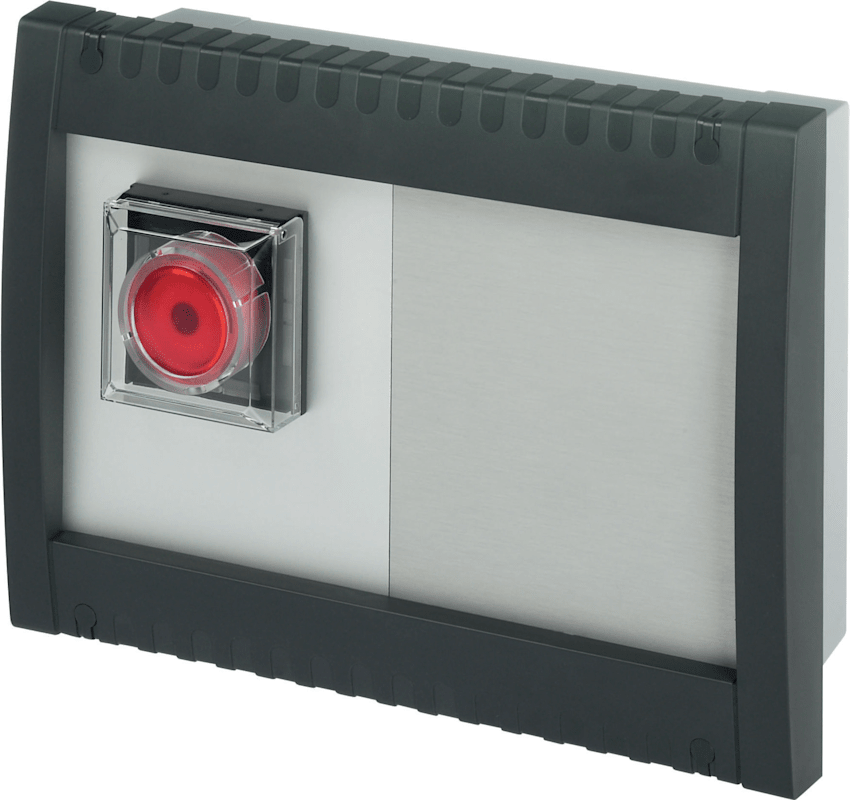 Zur Erweiterung der 925 Tableau - Modul - Basiseinheit mit einer NOT-Taste zur zentralen Freischaltung von Fluchttürabsicherungen ohne örtliche Nottaste über eine Sicherheitsrelaisschaltung.|Mit nicht splitternder Notschalterschutzhaube.