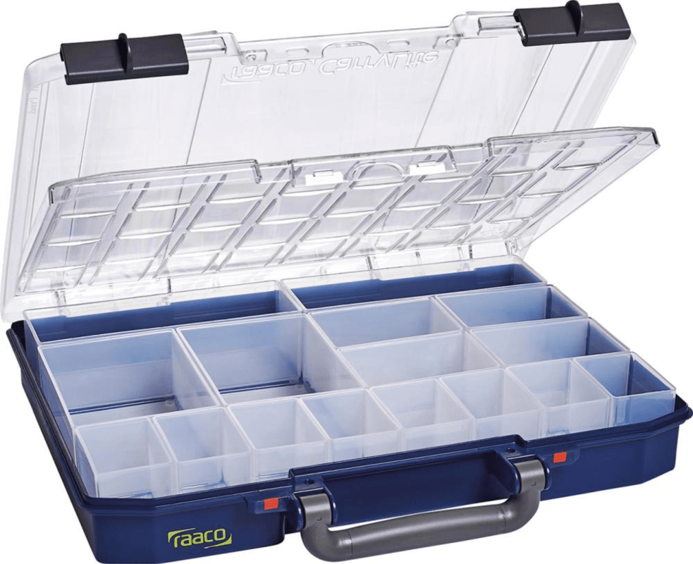 Sortimentskoffer CarryLite 55 4x8-16 DLU • Sortimentskasten: aus schlagfestem Polypropylen (PP), säuren- und basenresistent • Mit Schiebeverschlüssen und Tragegriff • Deckel: aus bruchsicherem Polycarbonat (PC) • Sandwichdeckel mit Einlegefach: für die Aufnahme von Dokumenten • Profilraster in Deckel und Boden: verhindern das Verrutschen des Inhalts Ausstattung mit 16 transparenten Einsätzen: 2x Typ A7-1 (H x B x T: 47 x 79 x 109 mm) 4x Typ A8-1 (H x B x T: 47 x 55 x 79 mm) 2x Typ A8-2 (H x B x T: 47 x 55 x 157 mm) 8x Typ A9-1 (H x B x T: 47 x 39 x 55 mm)