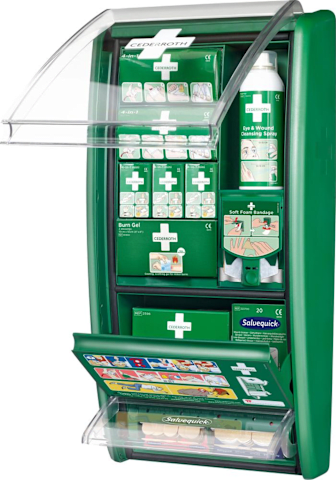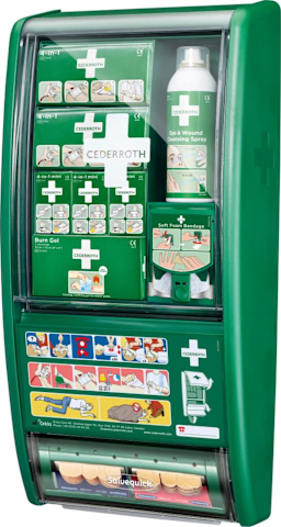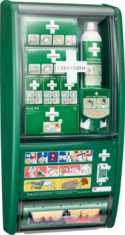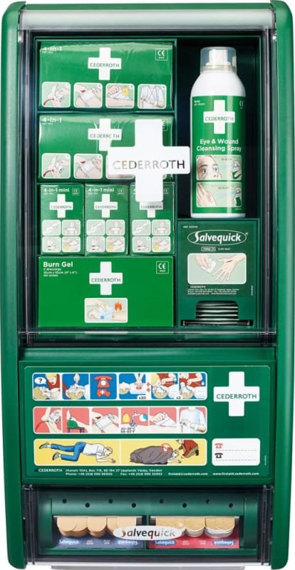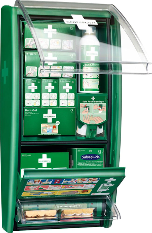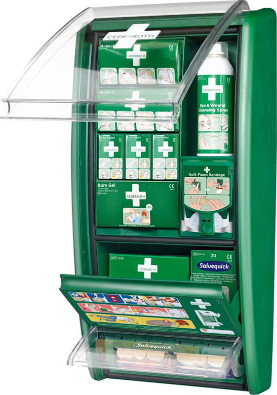 Erste-Hilfe-StationEigenschaften: • Bestückt für verschiedene Arten von Verletzungen • Anpassung an unterschiedliche Einsatzbereiche möglich • Für alle Berufsgruppen wie etwa Köche, Elektriker oder