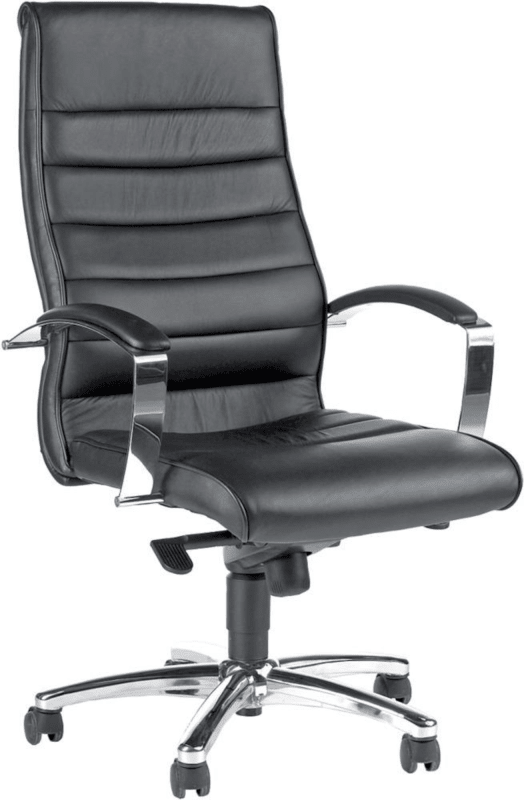 Chefsessel Modell TD LUX 10 • Bezugsstoff: echtes Leder, Lehne und Sitz aufwendig gesteppt, schwarz, Seitenteile in farbgleichem Kunstleder • Rückenlehne: konturgeformt, mit Wirbelsäulen-Ausformung und Lendenwirbelstütze, taillierte Rückenlehnenform für größtmögliche Armfreiheit, über Rastermechanik höhenverstellbar • Untergestell: Stahl-Fußkreuz, verchromt • Rollen: mit lastabhängig gebremsten Sicherheitsdoppelrollen für weiche Böden • Stahl-Armlehnen: mit Lederauflage • Technik: Kniematic-Wippmechanik, individuell auf das Körpergewicht einstellbar • Sitzhöhenverstellung: stufenlos, mit TOPLIFT (TÜV-geprüft), DIN EN 1335 Teil 1–3